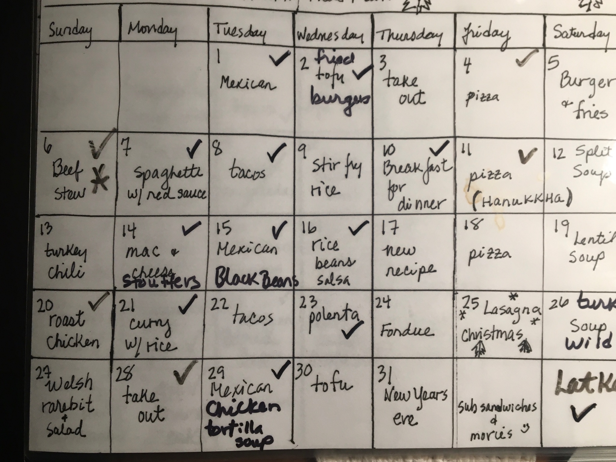 Here’s my December menu plan. I fill in the regulars like Taco Tuesday and Pizza night and then see what is in freezer /pantry. I don’t make the menu on the day except for the regulars so like spaghetti might be listd on the 7th but was made on the 14th. It jsut depends. Holidays I do keep to the menu since that’s different.