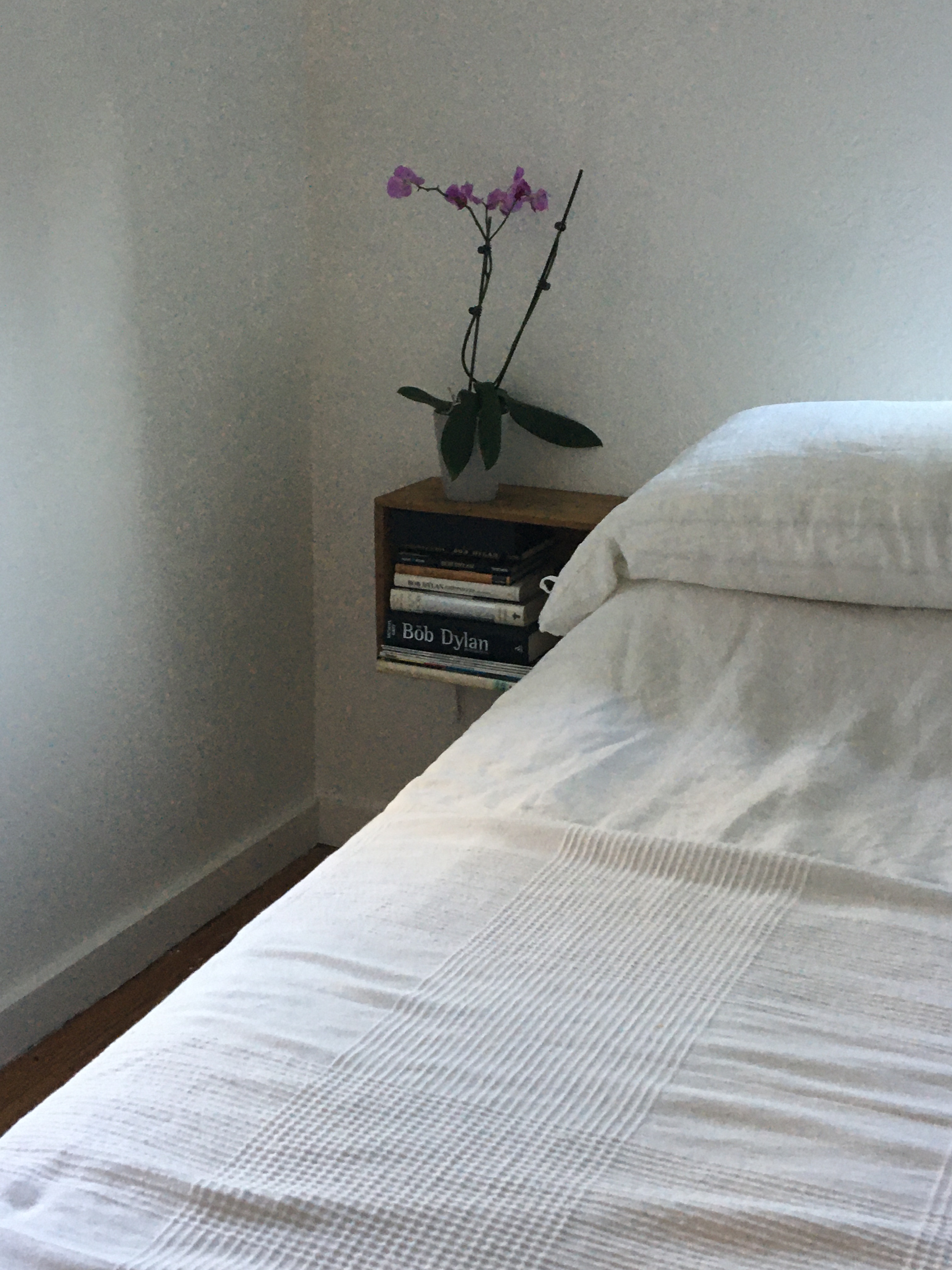 I keep one orchid in this room on the crate that was mounted on the wall. I put B’s collection of Dylan books inside the crate.