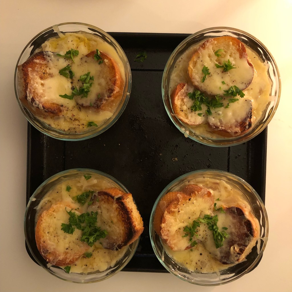 I’ve cooked some great meals this past week from ‘The Le Creuset ‘ cookbook. The french onion soup.