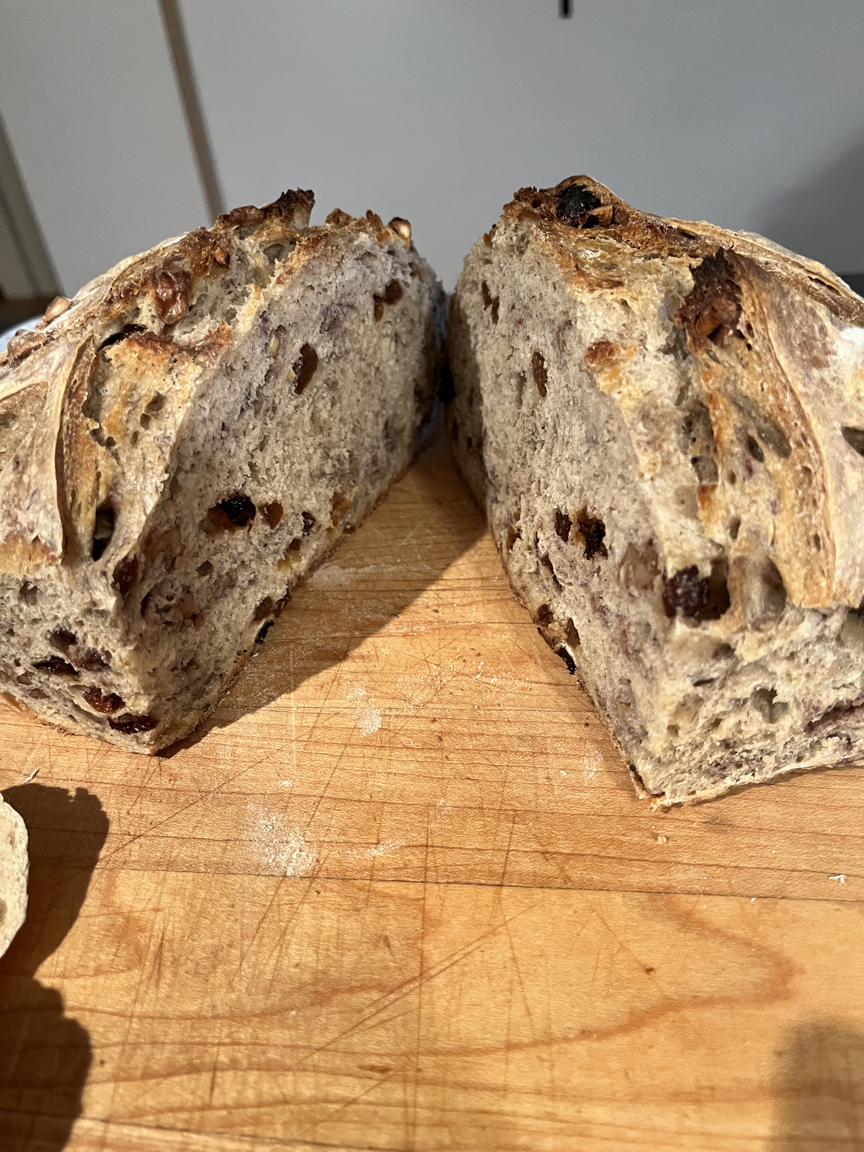 I’m going full steam on sourdough bread making and here’s today’s loaf: a walnut raisin loaf with some KA white wheat.