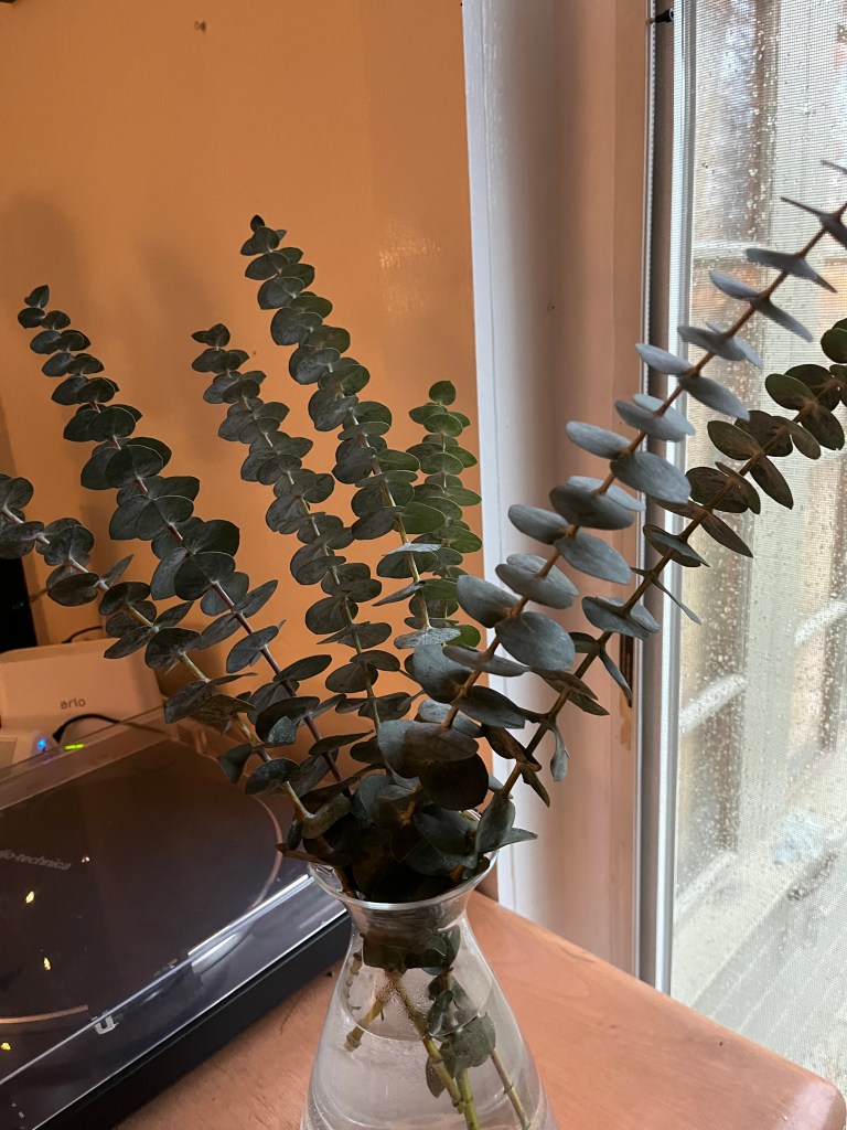 All the Christmas stuff is away and at Safeway, I bought a bunch of Eucalyptus branches to put in a glass jar.