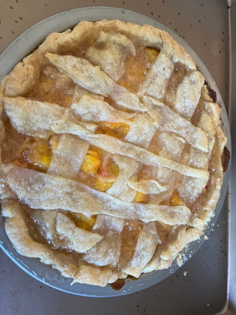 Not the prettiest lattice top but hopefully it tastes good. The peaches were very sweet. update: We had this with vanilla ice cream last night and it was yummy.