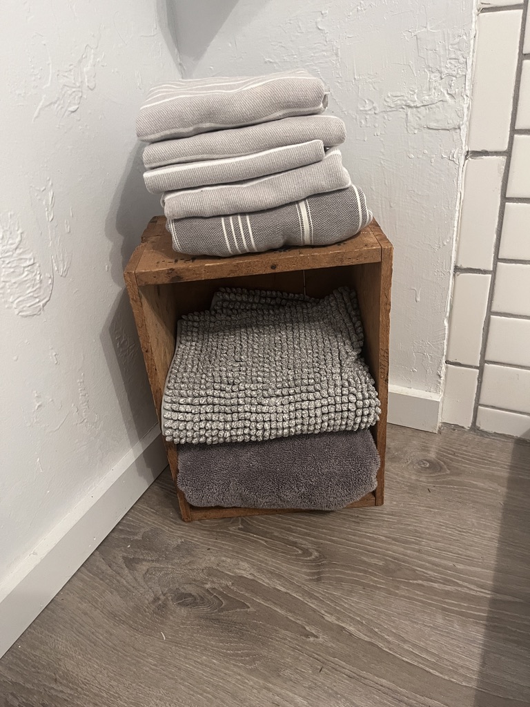 This is an old crate I had, and since I haven’t been able to find a place for our towels, this was suggested in this book: