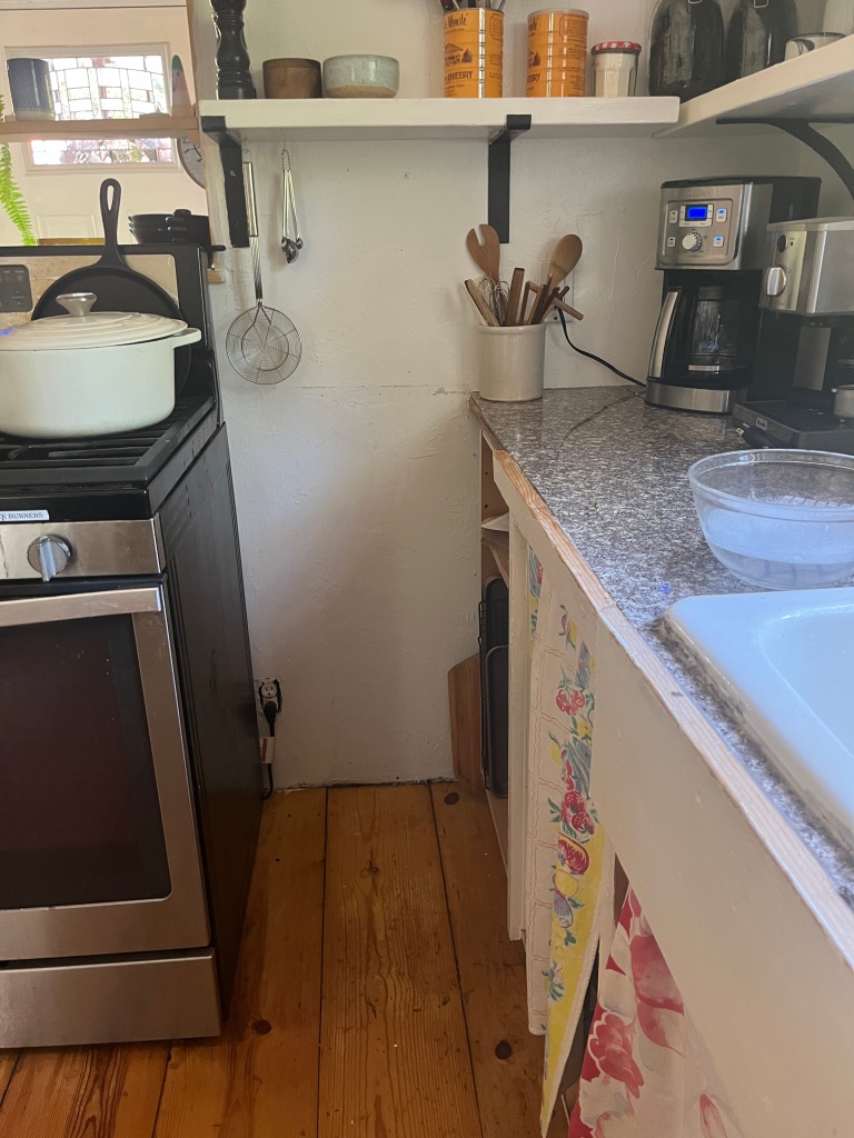 Yesterday, I went to the gym and the library. I was going to go to the pool, but I haven’t been to the gym in 2 weeks, so I felt I’d better tick that off the list. I didn’t have any holds at the library, so I picked up some random books off the ‘new shelf’. I came straight home after that. After I rested some, I went to work pulling out the cabinet by the stove that was beyond help. It only held our coffee things and my sheet pans.