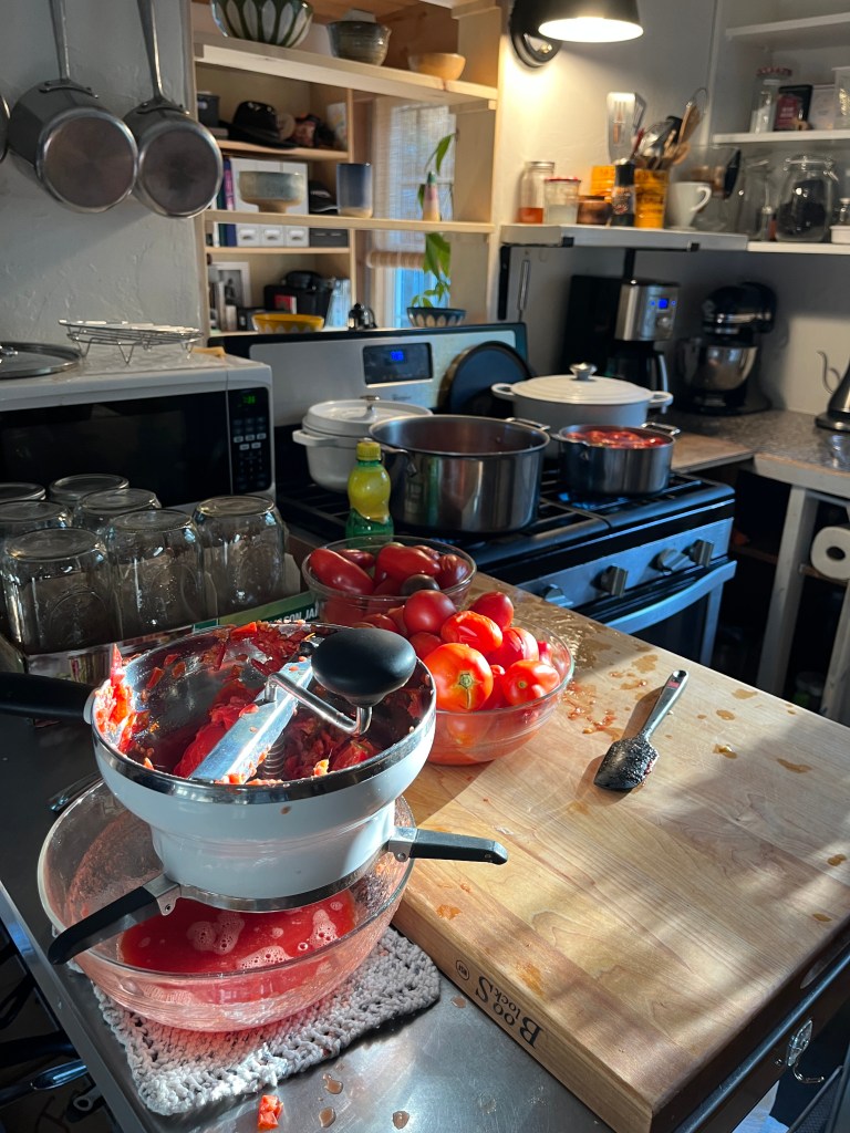 Yesterday, I canned 6 pints of tomato sauce and I’ll get another batch ready to go tomorrow. Usually I do it in 2 days. On day one I put the tomatoes in boiling water and then through the food mill. Day two, cook down and then can.