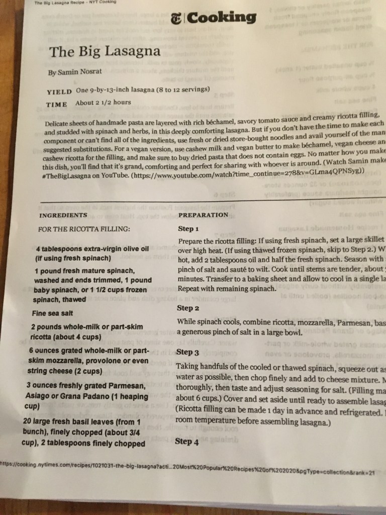 This is just the first page of the recipe, there are 2 more pages if you’re interested you can google it. It actually was huge and must have weighed 5 pounds. Lasagna is always our Christmas dinner. Not sure quite when this started but I remember when we were first married making lasagna since it was vegetarian.