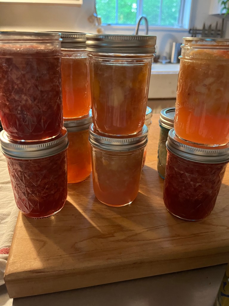 I’ve been canning jam all week. I made some peach jam which came out ok. I used the Pomona Pectin and can’t say I like it. It supposedly uses calcium water with pure pectin(both in the packet) to firm the jams. I wasn’t impressed. I bought 3 packs of the Pomona but I doubt I’ll use them unless I don’t have Sure Jell or Ball pectin.