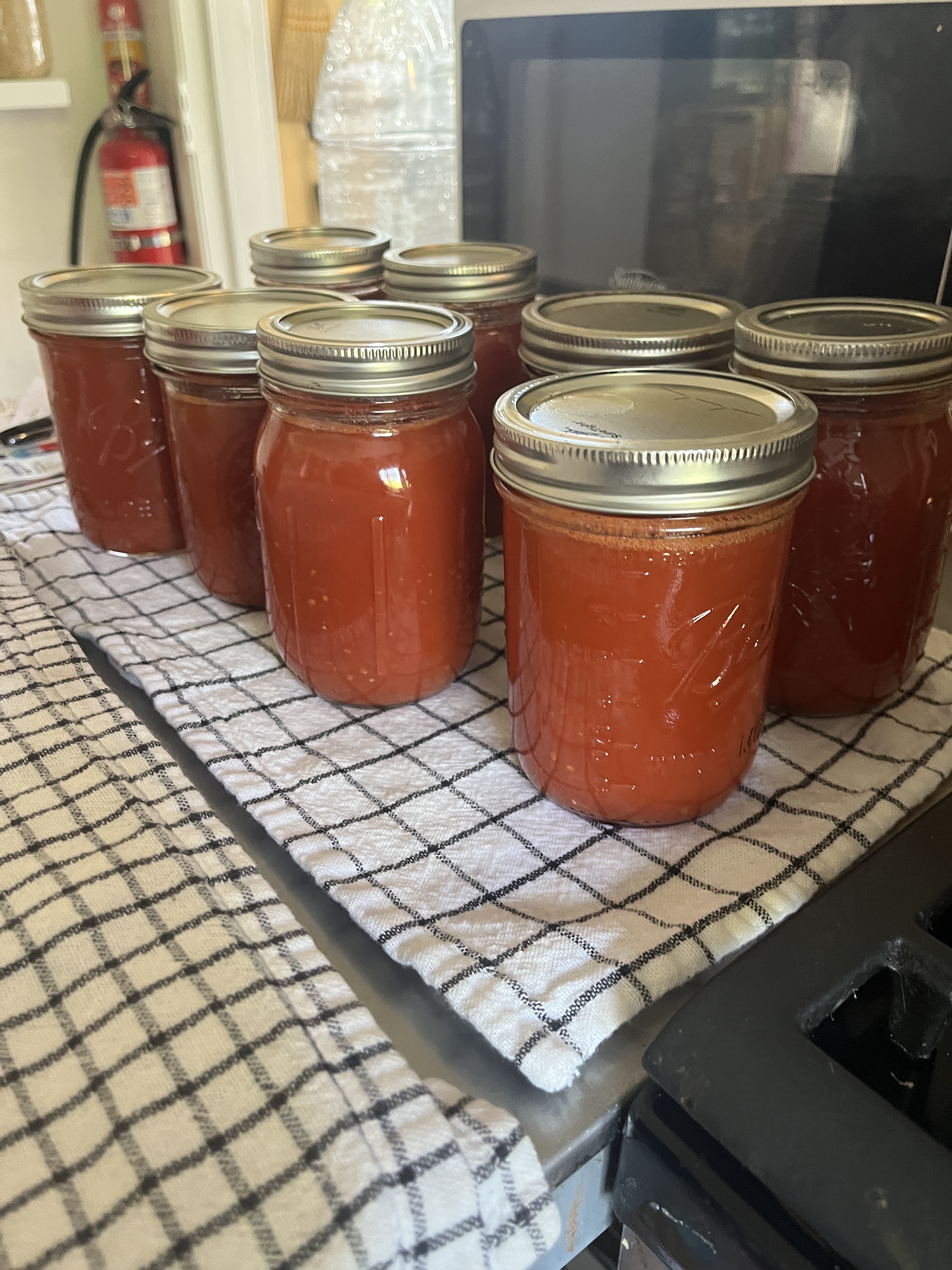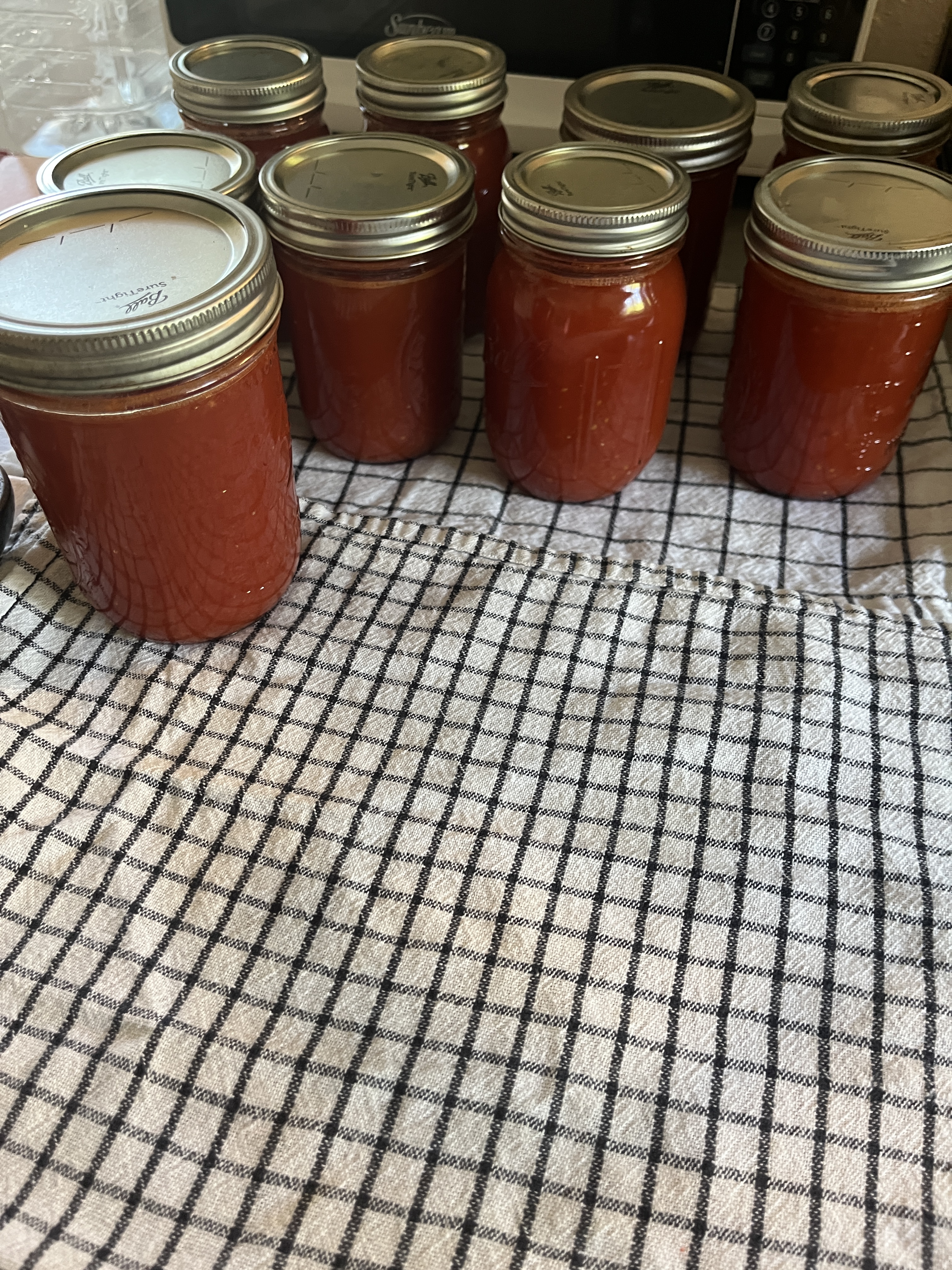 I did all the canning yesterday and ended up with 9 pints of tomato sauce and 6 pints of chicken broth. One of the chicken broth didn’t seal which is very rare for me, but I think I had wiped the rim with the vinegar solution and left too much on.